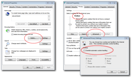 6. Click the Advanced button. In the pop-up window, make sure the Override automatic cookie handling checkbox is turned off.