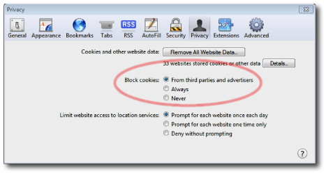 4. In the Block Cookies section, select the From third parties option. (The Never option works as well, but we don't recommend it.)